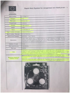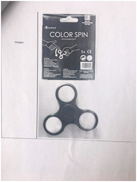 За інформацією, отриманою з міжнародної системи повідомлення про продукцію, що становить серйозний ризик (RAPEX), іграшка спінер (англ. Fidget Spinner) COLOR SPIN LED модель CS5555 SYM0024 становить серйозний ризик, оскільки акумуляторний відсік спінеру легко відкрити без використання будь-яких інструментів та отримати доступ до елементів живлення, які дитина може покласти у рот і проковтнути, що, в свою чергу, завдасть шкоди їі шлунково-кишковому тракту.