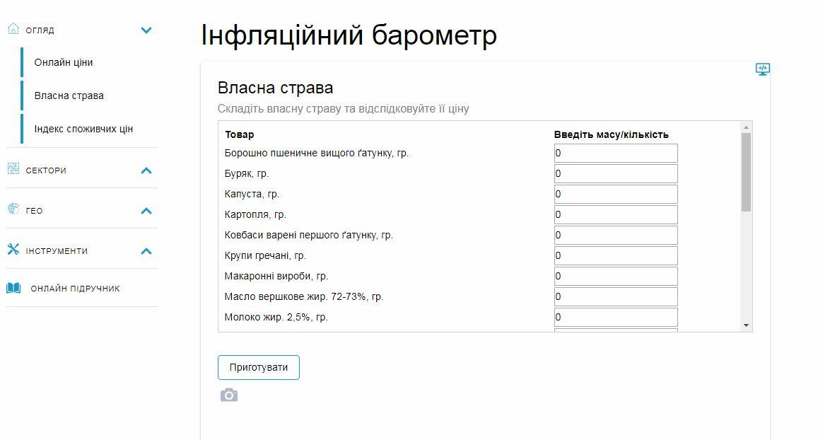 За допомогою цього сервісу користувачі можуть відстежити зміни вартості 23 основних соціальних продуктів. Окрім цього, можна дізнатися собівартість будь-якої страви з них, прописавши інгредієнти і їх вагу.