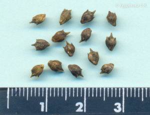 Плід – обернено-яйцеподібна сім’янка в оплодні, біля основи клиноподібна, здавлена, з 5-7 дрібними (до 1 мм) шипиками навколо верхньої опуклої частини й одним більшим у центрі, на верхівці. Поверхня часто з поздовжніми й поперечними смугами й сітчастою зморшкуватістю. Забарвлення від зеленувато-сірого до коричневого. Довжина сім’янки в оплодні 2,5- 3,25 мм, ширина й товщина 1,5-2 мм. Оплодень досить легко відділяється від сім’янки, тому в продукції можуть бути як сім’янки в оплодні, так і власне сім’янки.