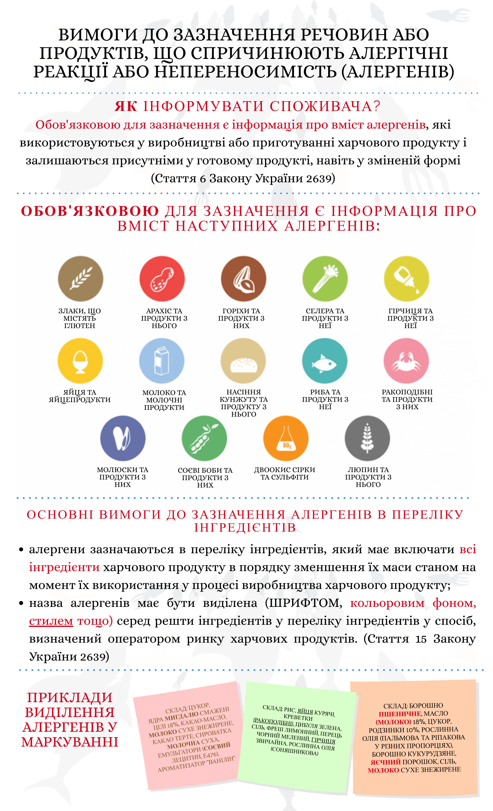Статтею 15 Закону України надаються роз’яснення, яким чином алергени повинні зазначатися на маркуванні харчових продуктів. Важливо наголосити на тому, що обов’язковою для надання є інформація про вміст алергенів, що визначені додатком № 1 до Закону. Алергени повинні зазначатися в переліку інгредієнтів харчового продукту, який має включати всі інгредієнти в порядку зменшення їх маси станом на момент їх використання у процесі виробництва харчового продукту. Крім того, назва алергенів має бути виділена серед решти інгредієнтів харчового продукту за допомогою шрифту, кольору, фону, стилю тощо.