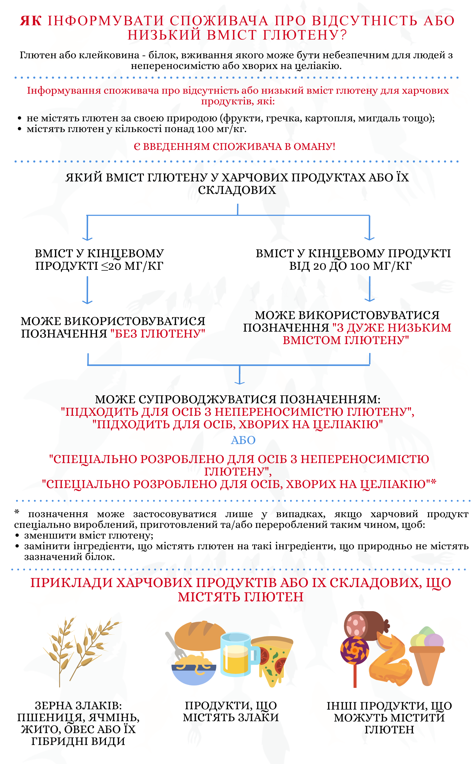 Окрему увагу, споживачам та операторам ринку слід звернути на вимоги щодо інформування споживачів про вміст глютену. Що таке глютен, кому не можна його їсти та чому більшості споживачів все ж таки не варто відмовлятися від нього описано у відповідній статті Міністерства охорони здоров’я.