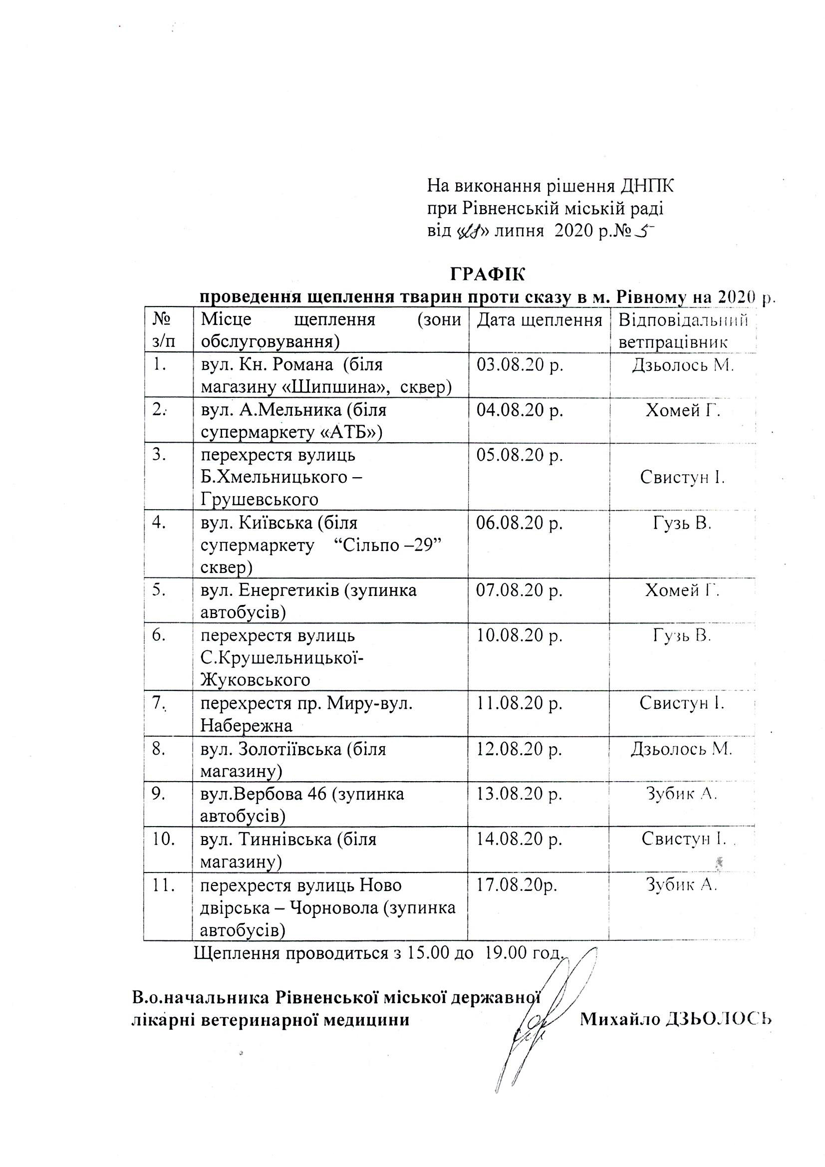 У період 03 по 17 серпня 2020 на території міста проводиться безкоштовна вакцинація собак та котів проти сказу згідно затвердженого графіку.