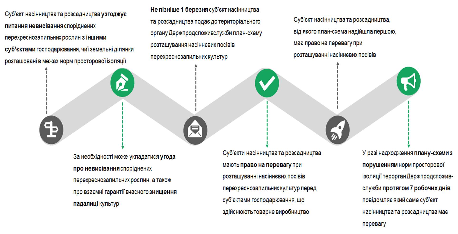 З процедурою узгодження можна детальніше ознайомитися в Наказі Міністерства аграрної політики та продовольства України від 07.10.2016  № 365 «Про затвердження Порядку узгодження розташування насіннєвих посівів».