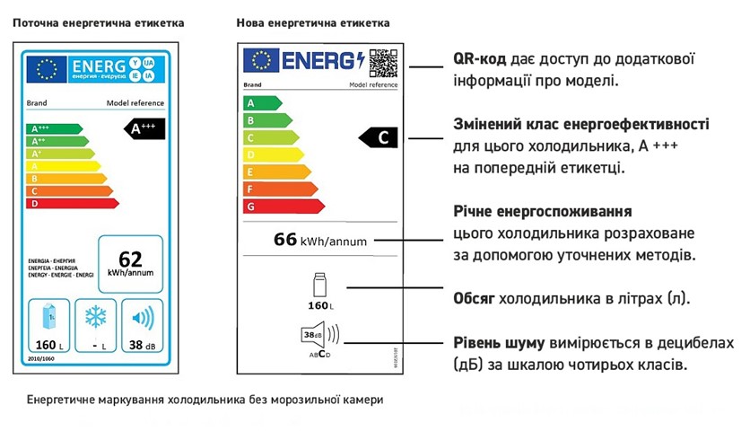 На етикетках енергоефективності за новими стандартами та старі маркування відрізнятимуться один від одного. Причина: впровадження нової класифікації та нових методів вимірювань у ЄС, при цьому обидві маркування є коректними.