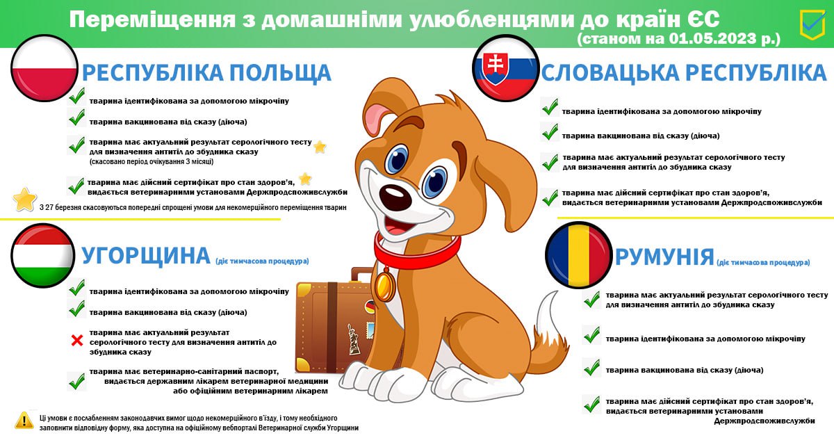 Поточні вимоги до некомерційного переміщення тварин на територію країн ЄС, що межують з Україною станом на 01.05.2023 відображені на інфографіці.