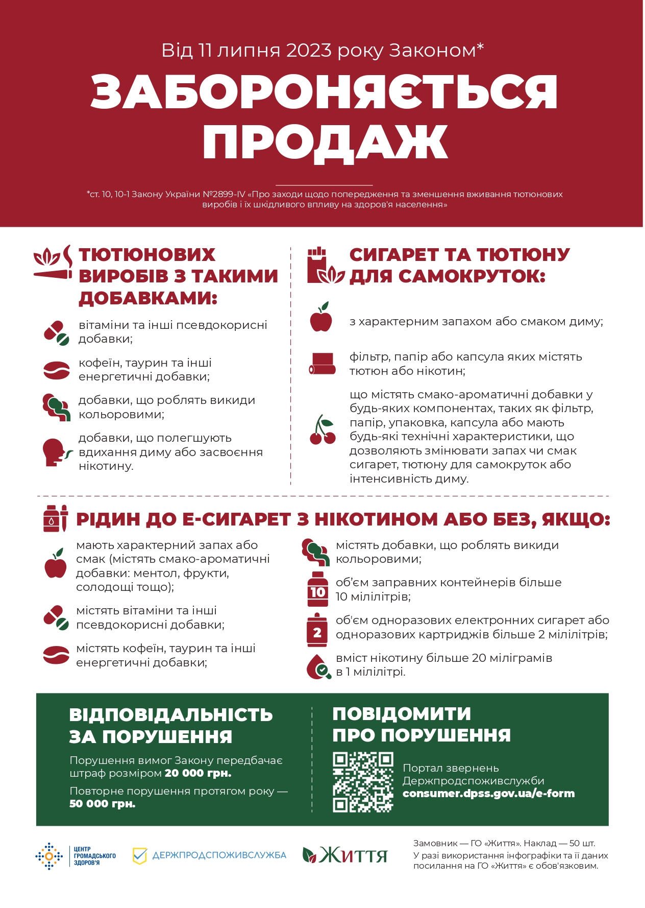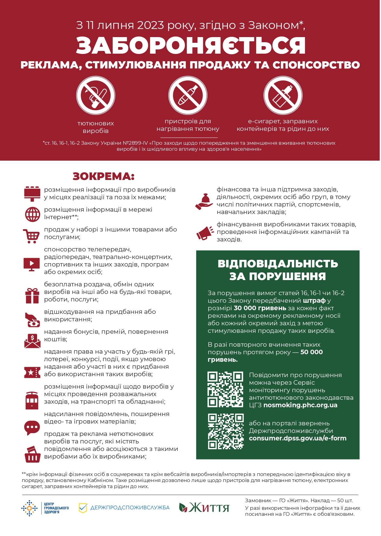 - заборону реклами та стимулювання продажу тютюнових виробів, електронних сигарет та рідин до них;