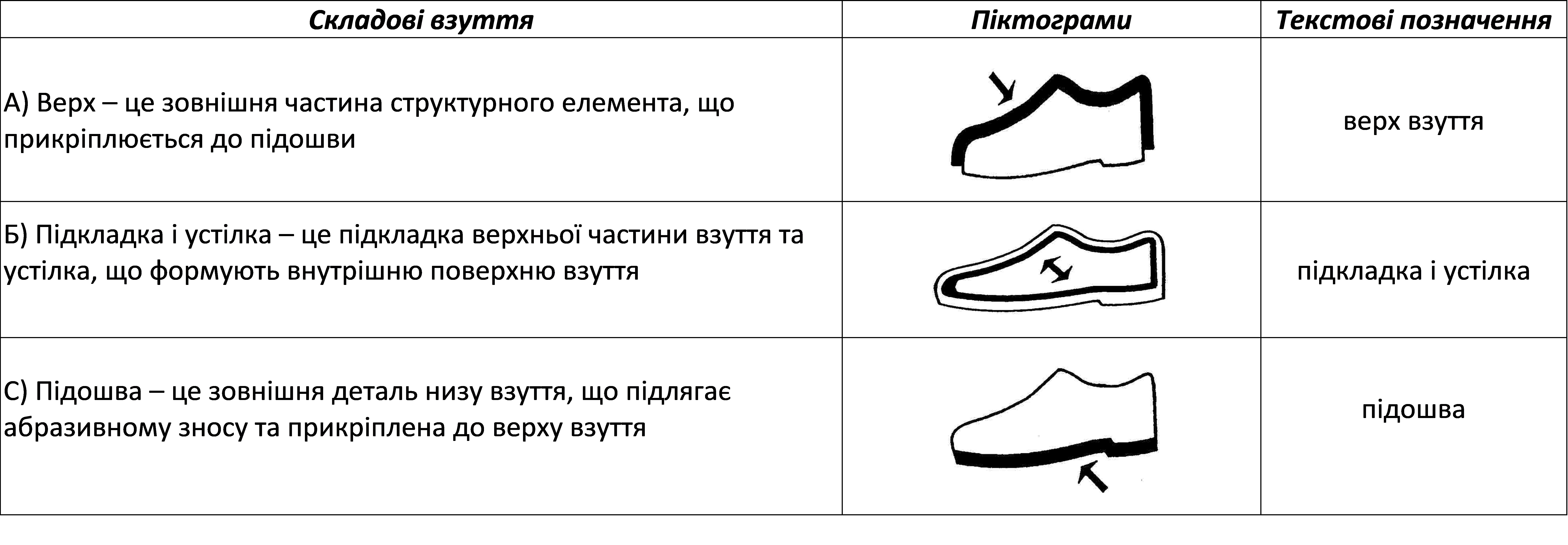Визначення і відповідні піктограми чи текстові позначення щодо складових взуття: