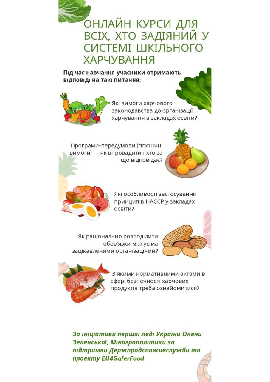 У рамках реформи шкільного харчування, яка ініційована першою леді України Оленою Зеленською, Мінагрополітики за підтримки Держпродспоживслужби та проекту ЄС EU4SaferFood розробило спеціальні безкоштовні онлайн курси. Відтепер персонал дотичний до дитячих їдалень, керівники шкіл і дитячих садочків, та батьки можуть пройти навчання з практичного впровадження норм харчового законодавства у закладах освіти.