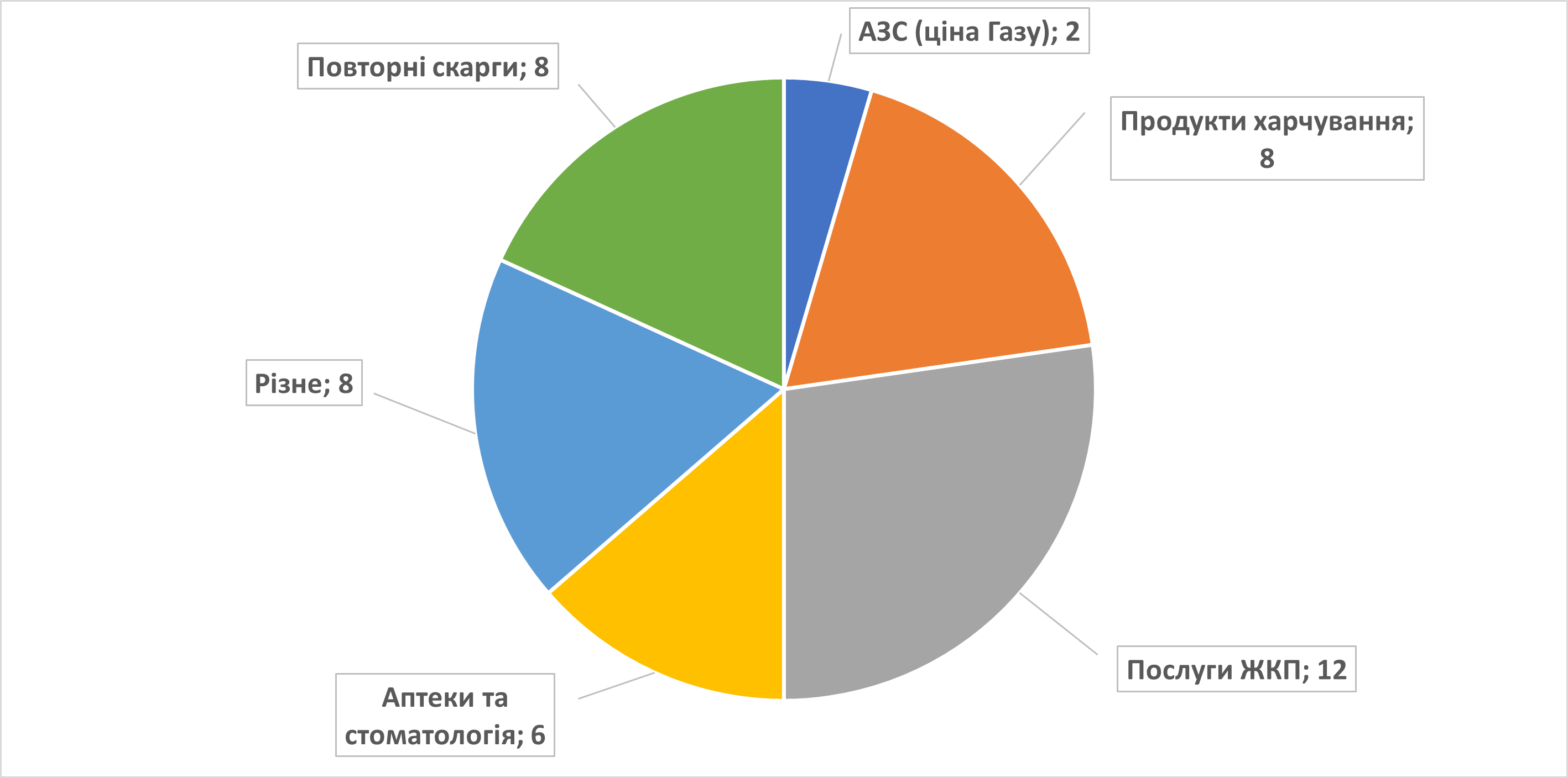 Так, до відділу контролю за регульованим цінами управління захисту прав споживачів та контролю за регульованими цінами надійшло 44 звернення громадян. Проведеним аналізом надходження звернень громадян протягом 2023 року досліджено, що питання викладені у зверненнях громадян різноманітні, оскільки стосуються порушень у різних сфер ціноутворення.