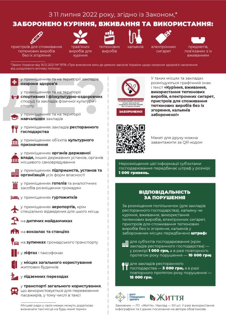 У місцях та закладах, в яких куріння, вживання, використання тютюнових виробів, електронних сигарет, пристроїв для споживання тютюнових виробів без їх згоряння, кальянів заборонено, розміщується наочна інформація, що складається з графічного знака про заборону куріння і тексту такого змісту: “Куріння, вживання, використання тютюнових виробів, електронних сигарет, пристроїв для споживання тютюнових виробів без їх згоряння, кальянів заборонено!”.