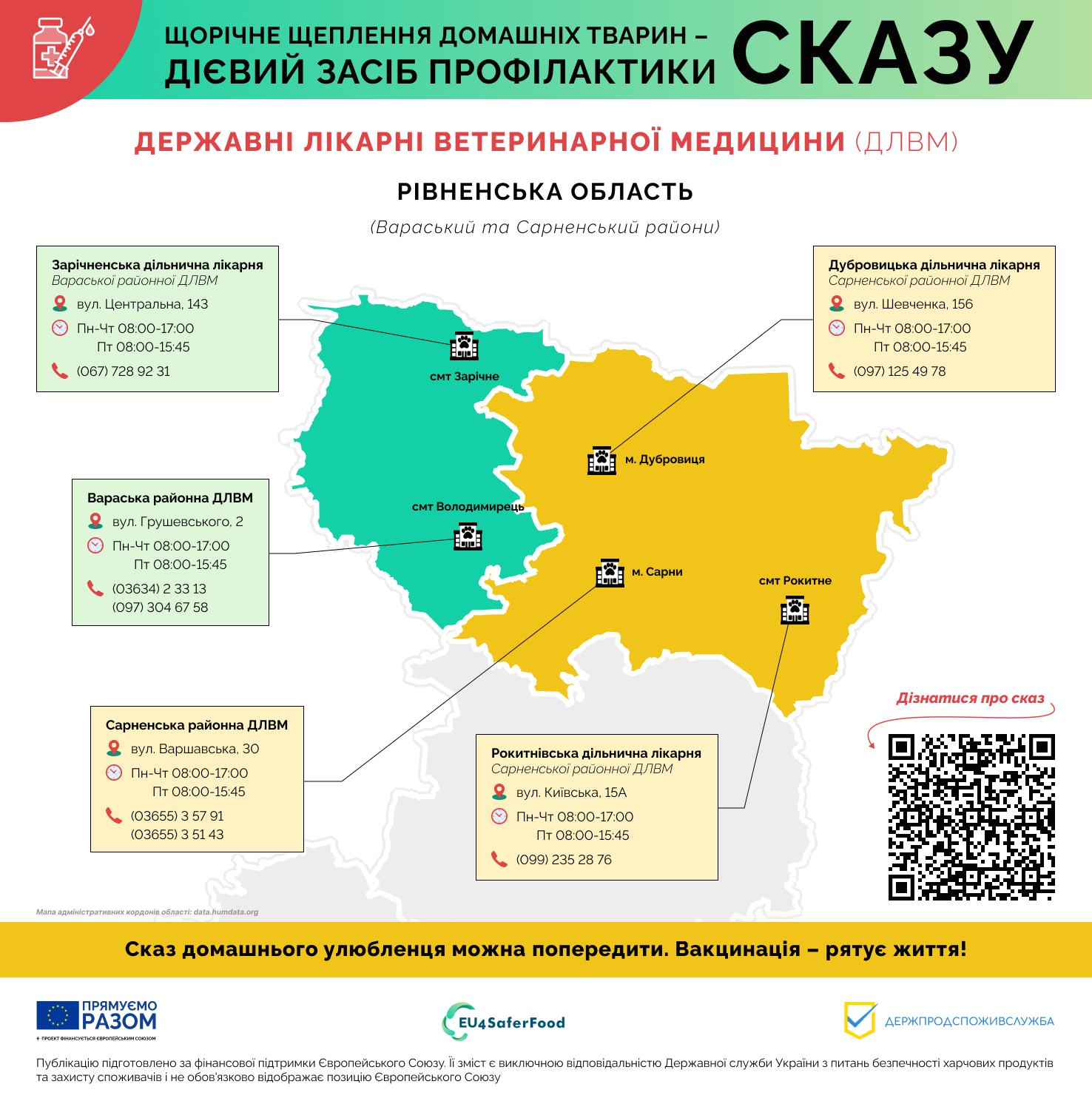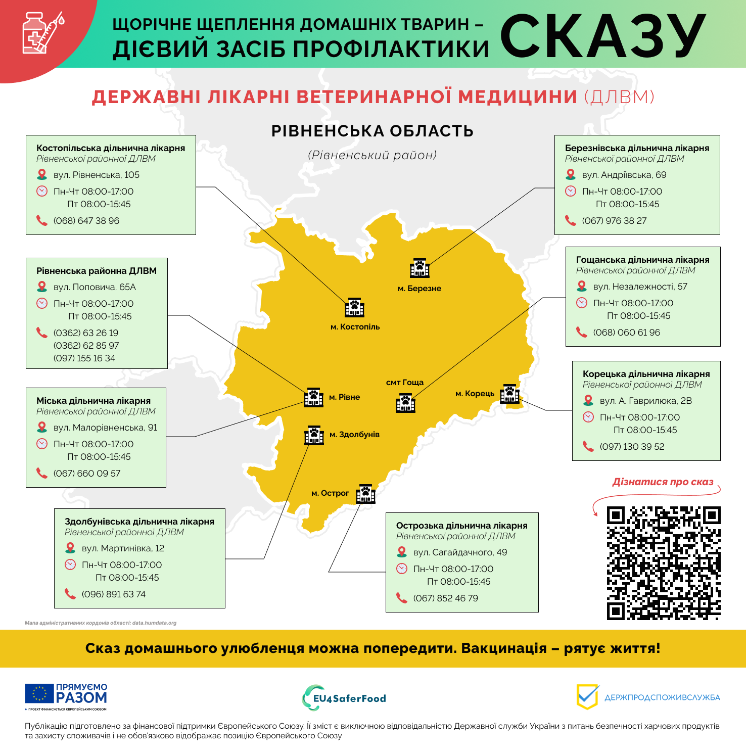 Перелік державних лікарень ветеринарної медицини області з адресами та контактною інформацією з питань безкоштовного щеплення своїх домашніх улюбленців проти сказу.