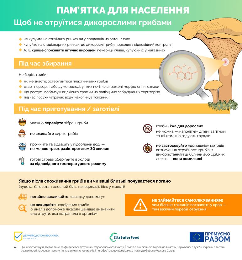 • купуйте гриби тільки у спеціально призначених для цього місцях – на агропродопольчих ринках і в закладах роздрібної торгівлі, де забезпечена наявність відповідного маркування з інформацією для споживача щодо походження, безпечності та якості продукту;