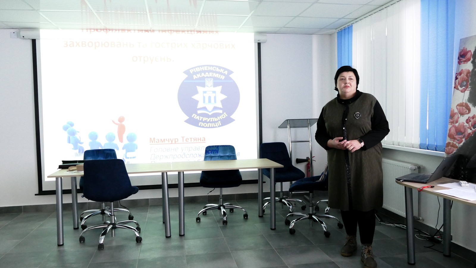 З метою здійснення профілактичних заходів, спрямованих на запобігання виникненню спалахів кишкових інфекцій та харчових отруєнь головний спеціаліст відділу санітарно-епідеміологічного нагляду та організації розслідування спалахів управління державного нагляду за дотриманням санітарного законодавства Тетяна Мамчур висвітлила тему «Профілактика інфекційних захворювань та гострих харчових отруєнь». Наголосила на ключових моментах попередження сальмонельозу, дизентерії, вірусного гепатиту А, ботулізму, грибних та інших отруєнь. Обговорено практичні рекомендації як не захворіти самому та попередити хвороби у свої близьких.