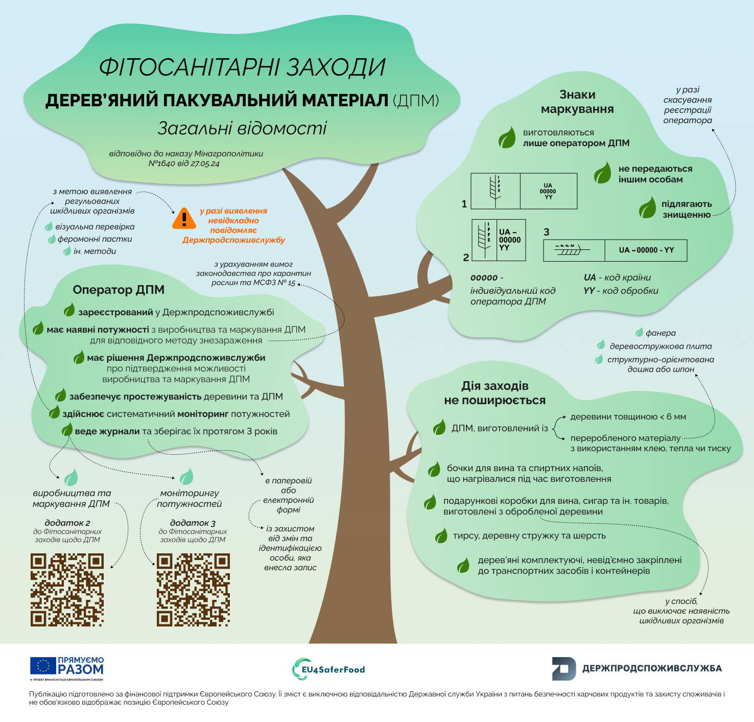 Наказом Міністерства аграрної політики та продовольства України від 27.05.2024 №1640 (https://zakon.rada.gov.ua/laws/show/z0968-24#Text) затверджені Порядок реєстрації осіб, які здійснюють господарську діяльність, пов’язану з виробництвом та обігом об’єктів регулювання, та Фітосанітарні заходи щодо дерев’яного пакувального матеріалу.