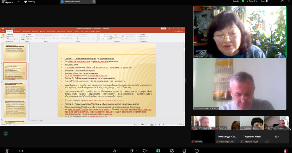 13.02.2025 відбулась спільна онлайн-нарада відділу контролю у сфері насінництва, розсадництва та якості зерна управління фітосанітарної безпеки ГУ Держпродспоживслужби в Рівненській області з суб’єктами насінництва та розсадництва Рівненської області, Департаментом агропромислового розвитку Рівненської облдержадміністрації, ДУ «Рівненська фітолабораторія» щодо дотримання вимог законодавства у сферах охорони прав на сорти рослин та насіння і садивного матеріалу в Україні та впровадження нового сервісу “е-рослинництво”.