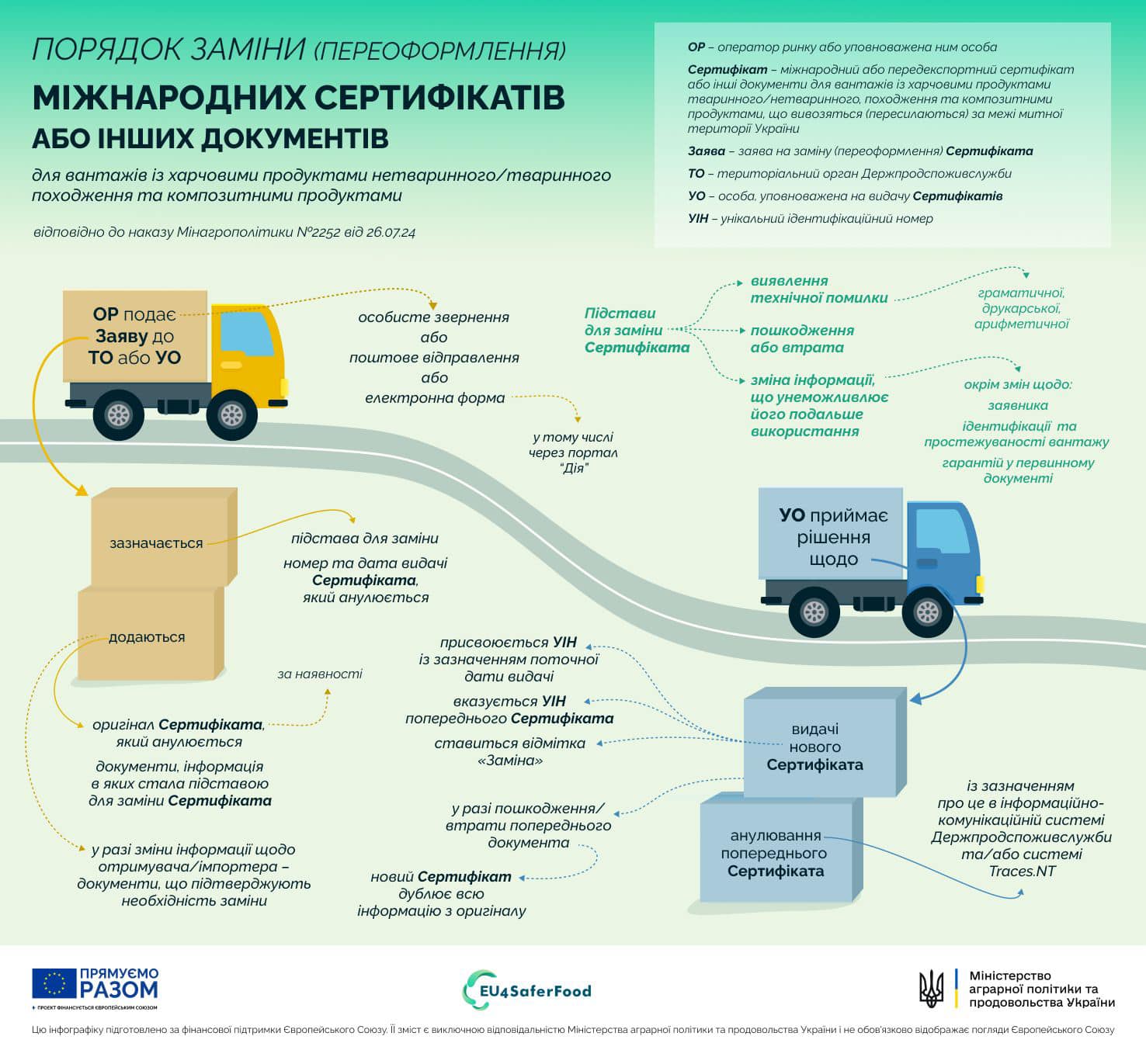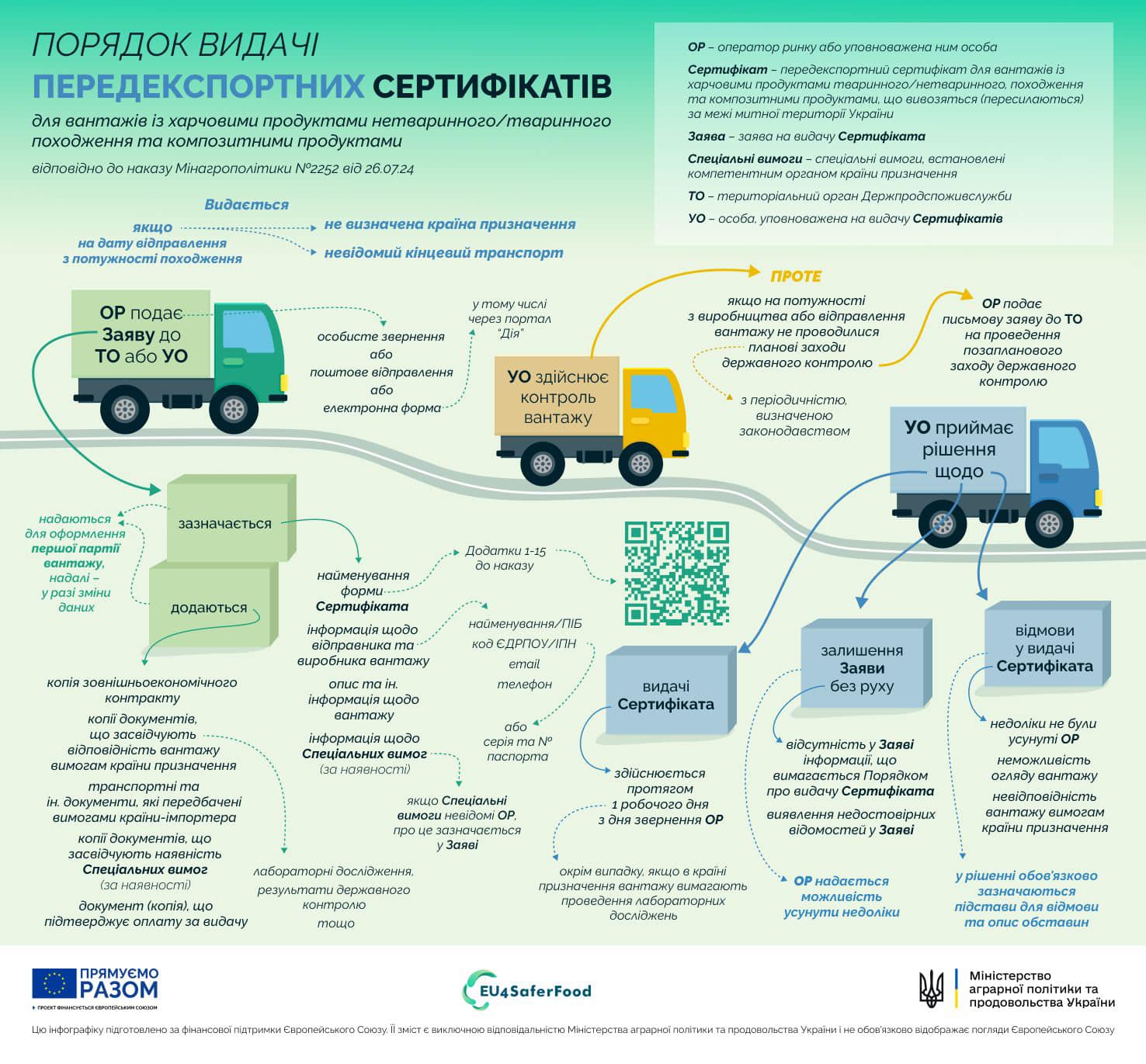 Детальніше про порядок видачі міжнародних сертифікатів – в наочних матеріалах, розроблених Мінагрополітики спільно з європейським проєктом EU4SaferFood.