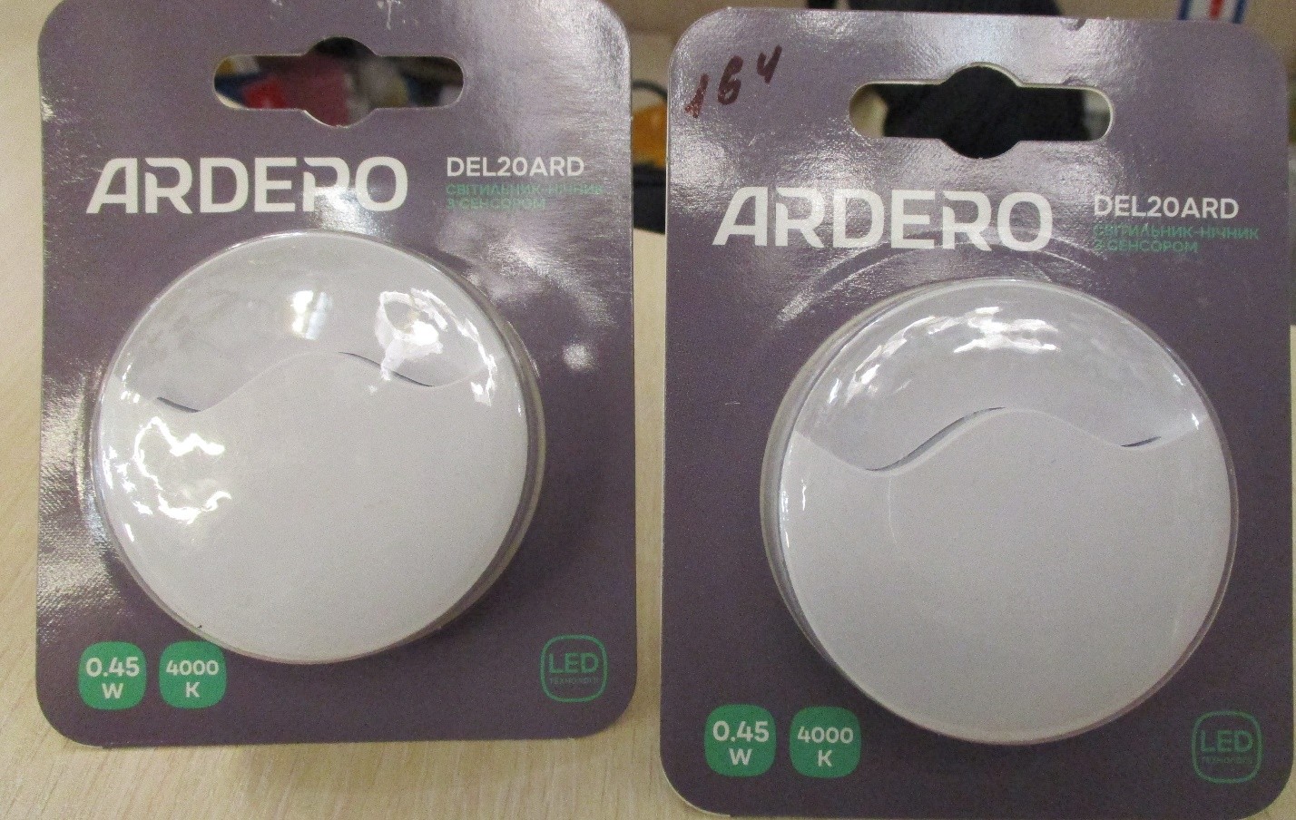 Під час проведення планової перевірки характеристик продукції у торговельній мережі м. Рівне встановлено – розповсюдження продукції світильник-нічник з сенсором DEL 20 ARD, LED, білого кольору, ТМ «ARDERO», 0,45 W, 4000K, дата виготовлення 09.2023, 23UA-JC-FERO1, штриховий код 4820273271343, яка не супроводжується енергетичною етикеткою та мікрофішею, електрообладнання не супроводжується інструкціями та інформацією про безпечність, складеними згідно з вимогами закону щодо порядку застосування мов, що є порушенням п.6, п.13 Технічного регламенту енергетичного маркування електричних ламп та світильників, затвердженого постановою Кабінету Міністрів України від 27.05.2015 №340, п. 13, п. 21, п.28 Технічного регламенту низьковольтного електричного обладнання, затвердженого постановою КМУ від 16.12.2015р. №1067.