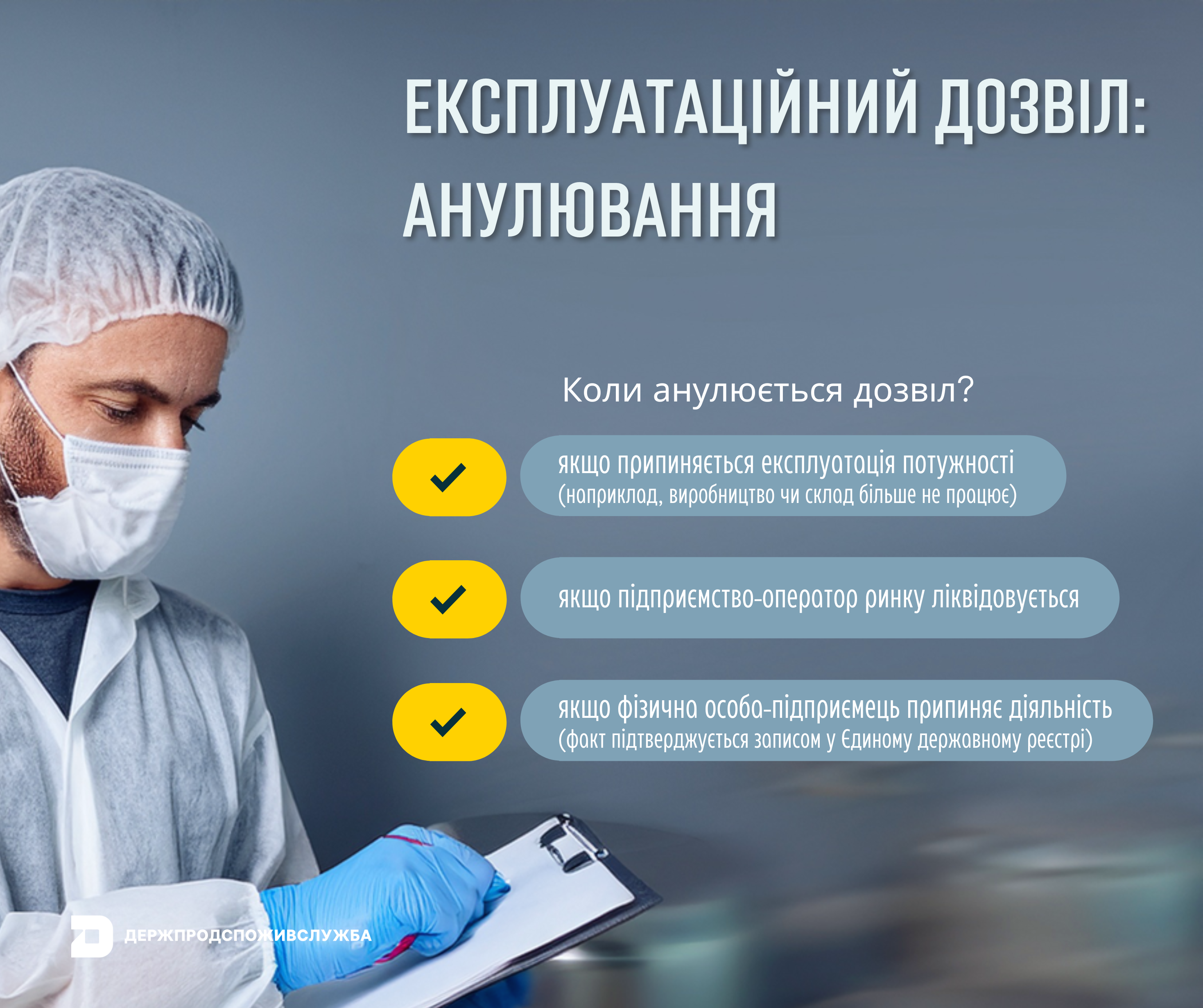 Оператор ринку подає заяву про анулювання експлуатаційного дозволу через ЦНАП або Дія до територіального органу Держпродспоживслужби. Зробити це потрібно не пізніше ніж за 5 робочих днів до припинення роботи потужності.