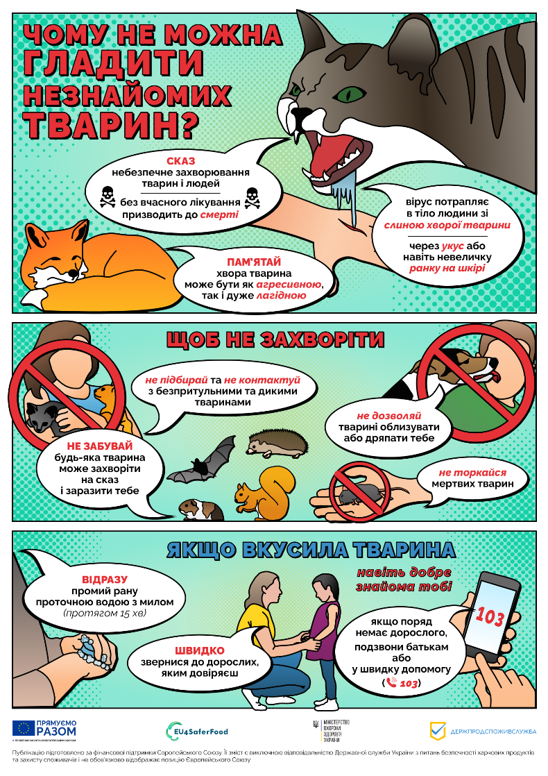 Детальніше – як потрапляє сказ в організм і що робити, якщо вас вкусила дика тварина – в інфографіці, розробленій спільно з європейським проєктом EU4SaferFood
