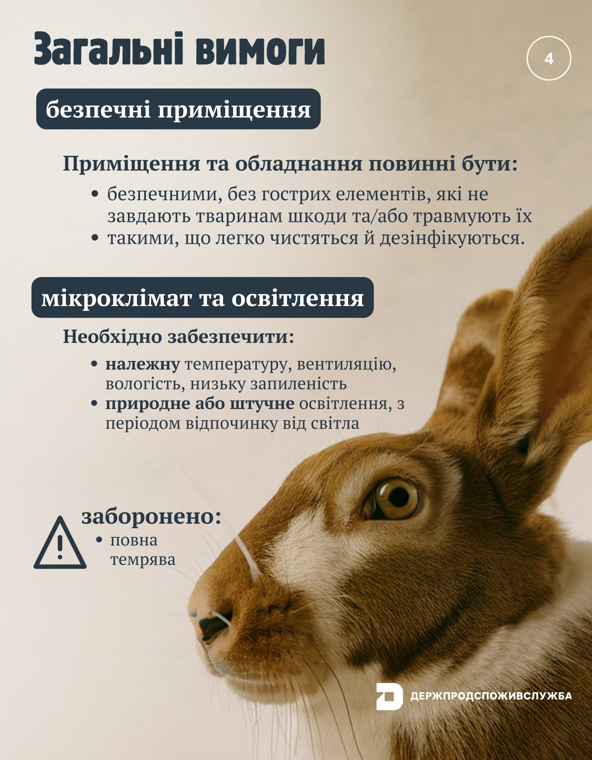 - Приміщення та умови утримання: безпечні, чисті, легко дезінфікуються; достатній простір, що задовольняє потреби тварин та свободу їх пересування, належний мікроклімат; природне або штучне освітлення; захист тварин під час вигулу від несприятливих погодних умов та хижаків.