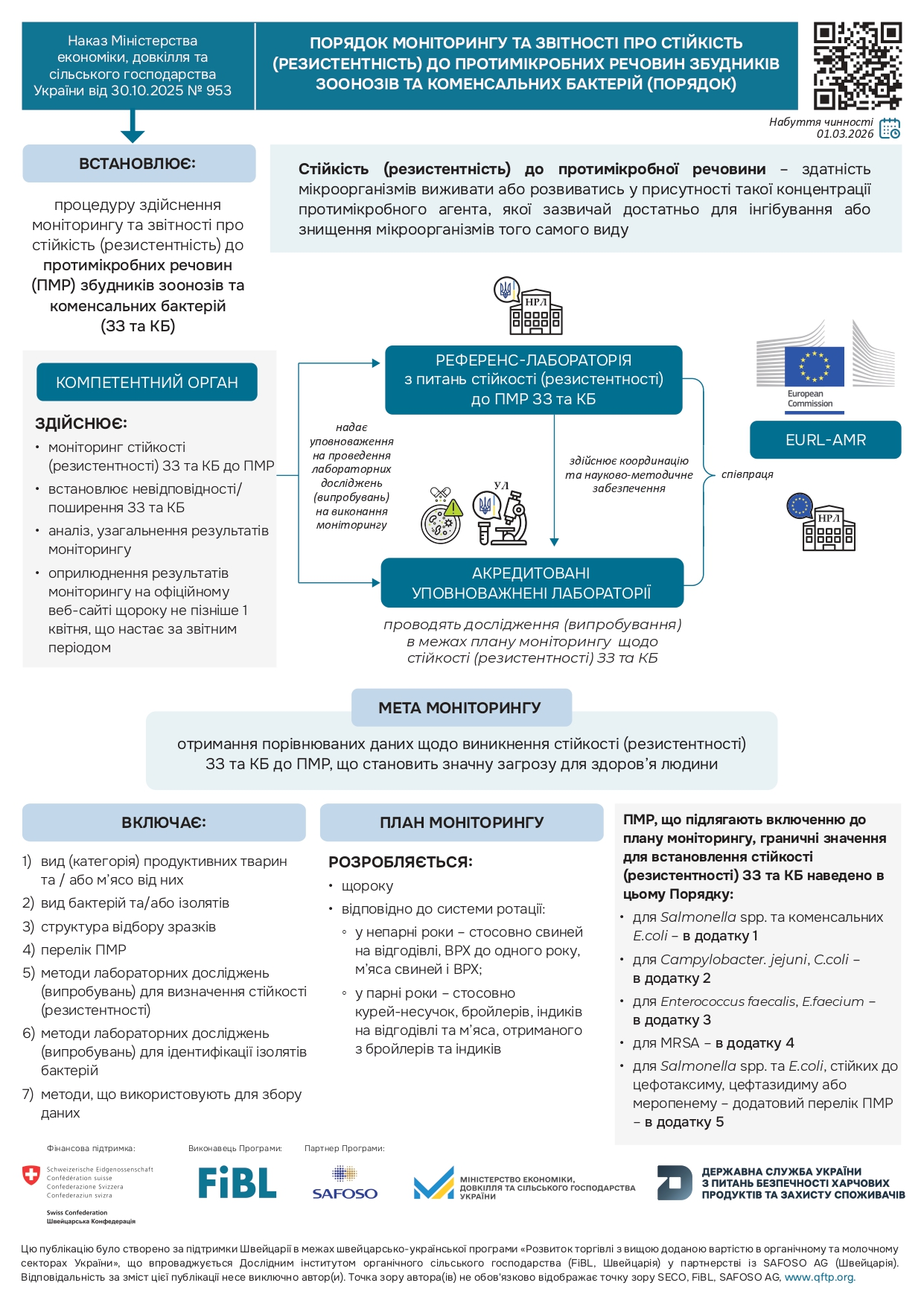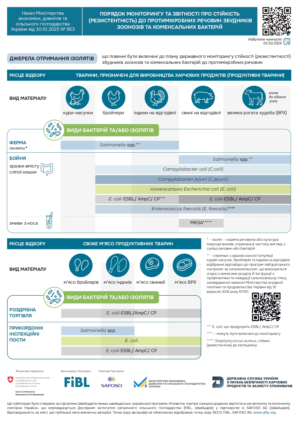 За підтримки Швейцарії у межах швейцарсько-української програми «Розвиток торгівлі з вищою доданою вартістю в органічному та молочному секторах України» (Quality FOOD Trade Program), що впроваджується Дослідним інститутом органічного сільського господарства (FiBL,Швейцарія) у партнерстві з SAFOSO AG (Швейцарія), Міністерством економіки, довкілля та сільського господарства України та Держпродспоживслужби створено інфографіки, в яких висвітлено основні положення  порядку моніторингу та звітності про стійкість (резистентність) до протимікробних речовин збудників зоонозів та коменсальних бактерій