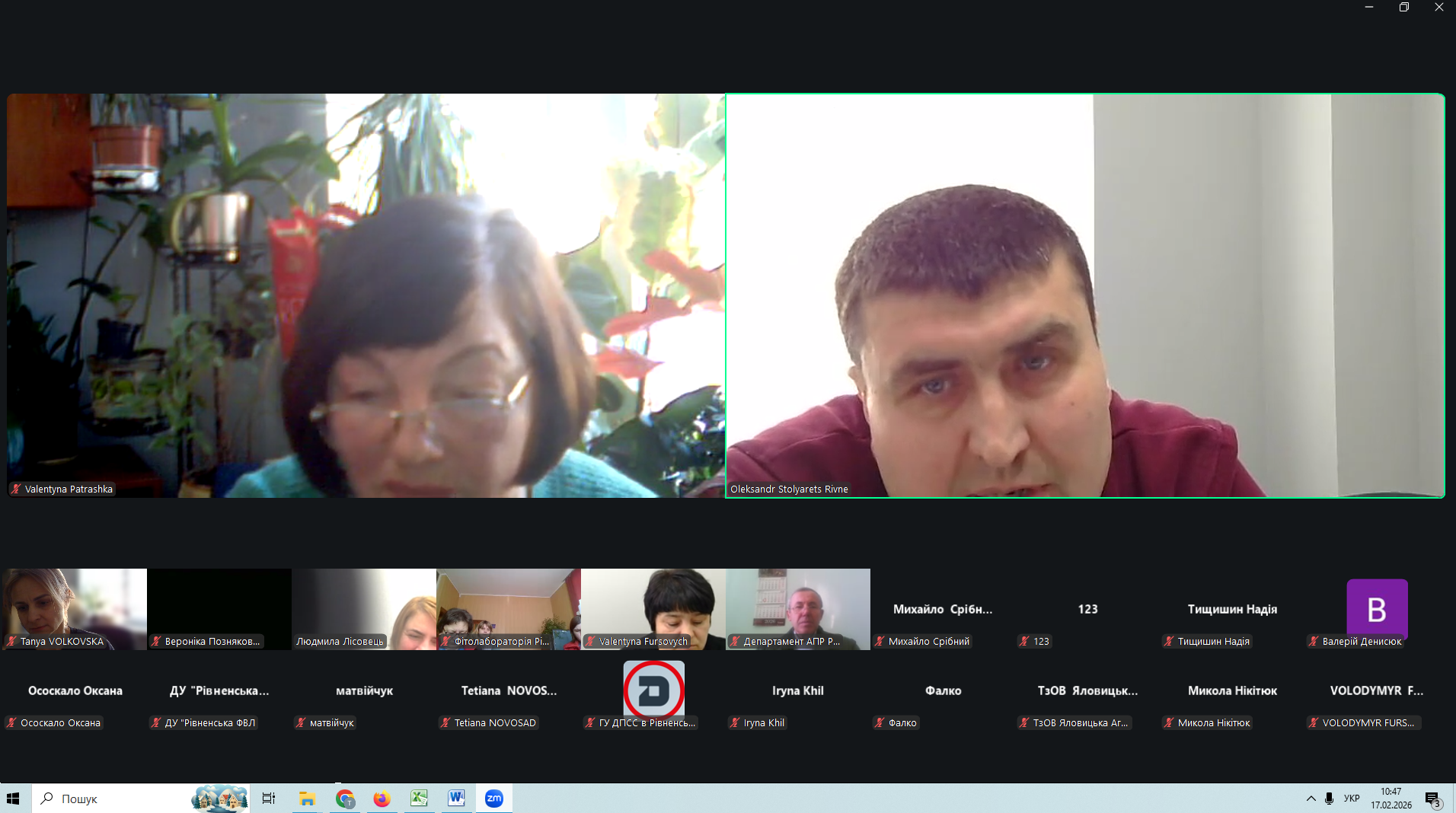 17.02.2026 відбулась спільна онлайн-нарада відділу контролю у сфері насінництва, розсадництва та якості зерна управління фітосанітарної безпеки з суб’єктами насінництва та розсадництва Рівненської області, Департаментом агропромислового розвитку Рівненської облдержадміністрації та ДУ «Рівненська фітолабораторія» щодо дотримання вимог законодавства у сферах охорони прав на сорти рослин та насіння і садивного матеріалу в Україні.