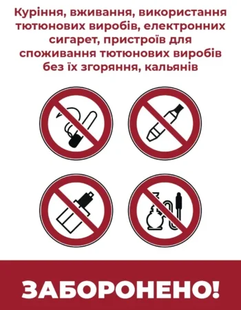 Куріння, вживання та використання тютюнових виробів, електронних сигарет, пристроїв для нагрівання тютюну на території та в приміщеннях навчальних закладів заборонено законом.