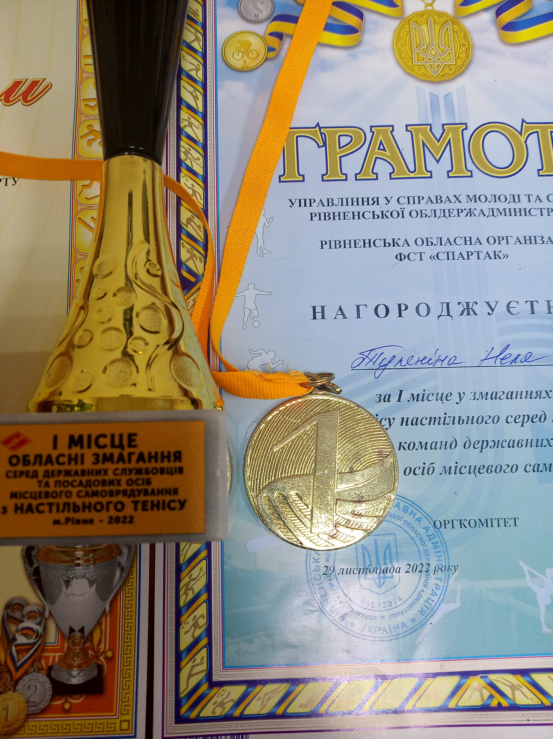 Участь у змаганнях з настільного тенісу взяла головний спеціаліст відділу безпеки середовища життєдіяльності управління державного нагляду за дотриманням санітарного законодавства Головного управління Держпродспоживслужби в Рівненській області ТУЛЕНІНА НЕЛЯ НАЗАРІВНА, яка перемогла та завоювала І призове місце серед жінок, що принесло І призове з настільного тенісу всій спортивній команді.